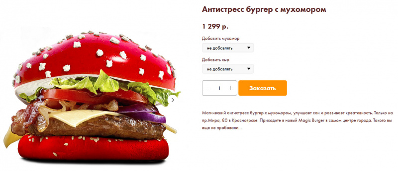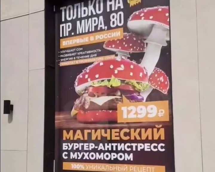 К моей радости, ближе к завершению года начинают появляться серьезные претенденты на #хим/дичь. На сей раз найдено ЭТО в Красноярске, в рамках сети фаст-фуда Magic burger (тыц!). В изделие планируют добавлять мухомор (скорее всего сушеный, из ларьков микродозинга, которыми известна РФ). Стоить все будет (с 27 августа) - 1299 RUR (~20$).