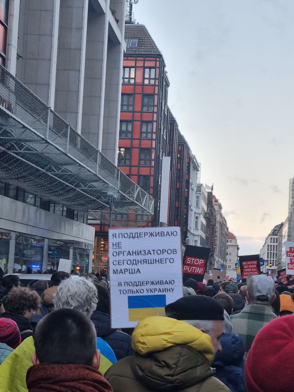 Антивоенный марш шел, в том числе, и с российскими триколорами, против чего возражали определенные участники, и их вполне можно понять: с российскими триколорами на марши в Европе обычно выходит всякая пропутинская сволочь, и было не очень понятно, зачем нужно было провоцировать совершенно ненужные ассоциации.