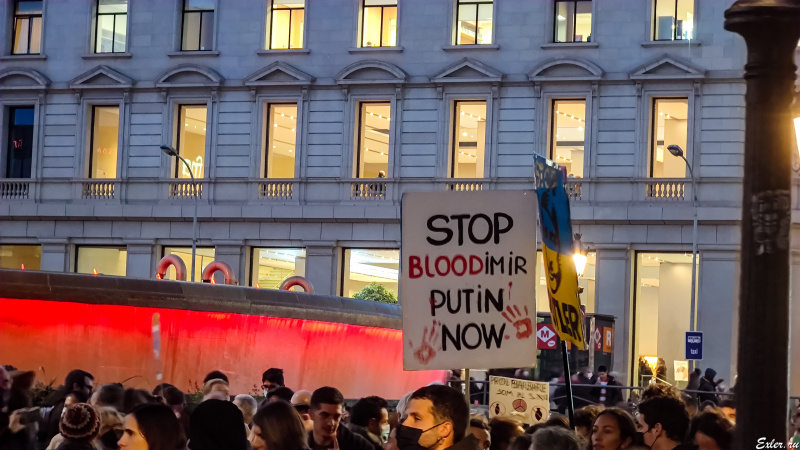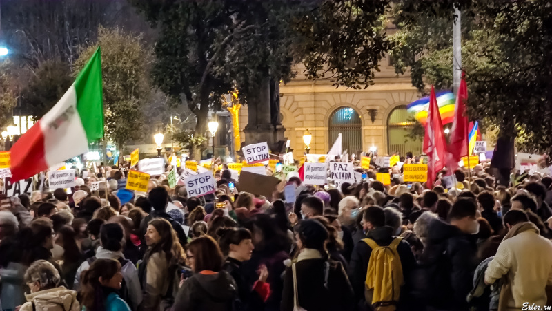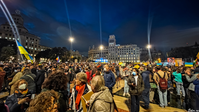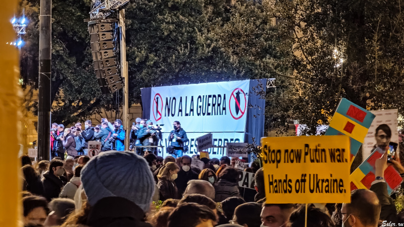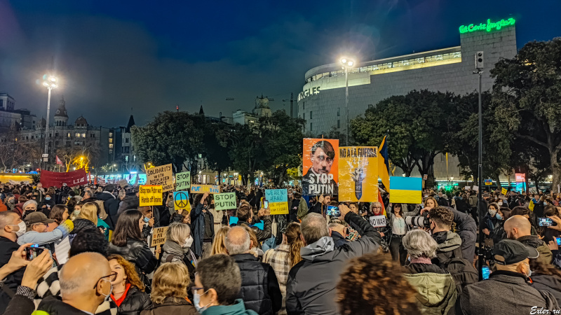 Плакаты в основном содержали требование остановить войну, Путина на плакатах называли военным преступником и новым Гитлером. Вообще вот этот образ Путина в виде Гитлера - постоянная тема большинства испанских и каталонских изданий.
