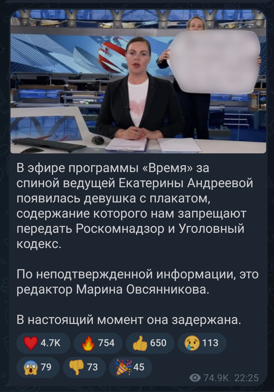 Юрист Павел Чиков сообщил в Telegram-канале, что за выход в эфир программы «Время» на «Первом канале» полиция задержала Марину Овсянникову, редактора «Первого канала». Она доставлена в столичное ОВД «Останкино». (Отсюда.)