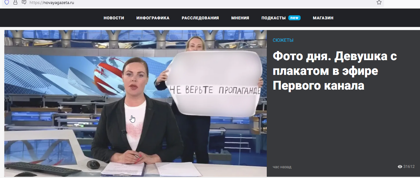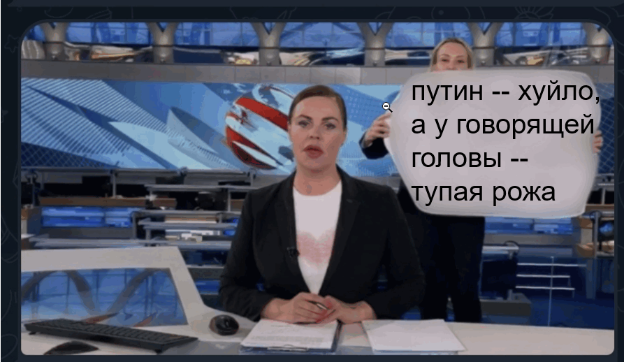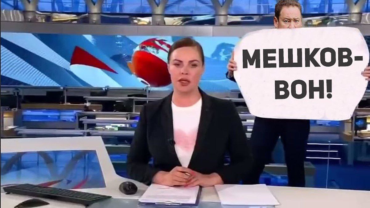 В прямом эфире «Первого канала» во время выпуска вечерних новостей в студию выбежала девушка с антивоенным плакатом.
