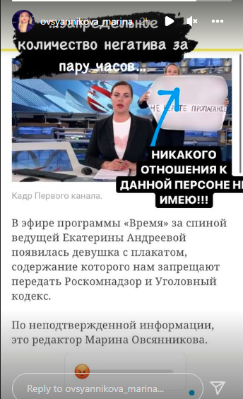 Она зашла в кадр за спину ведущей программы «Время» Екатерины Андреевой, держа в руках плакат. Эфир передачи не прервали, девушку показывали несколько секунд.