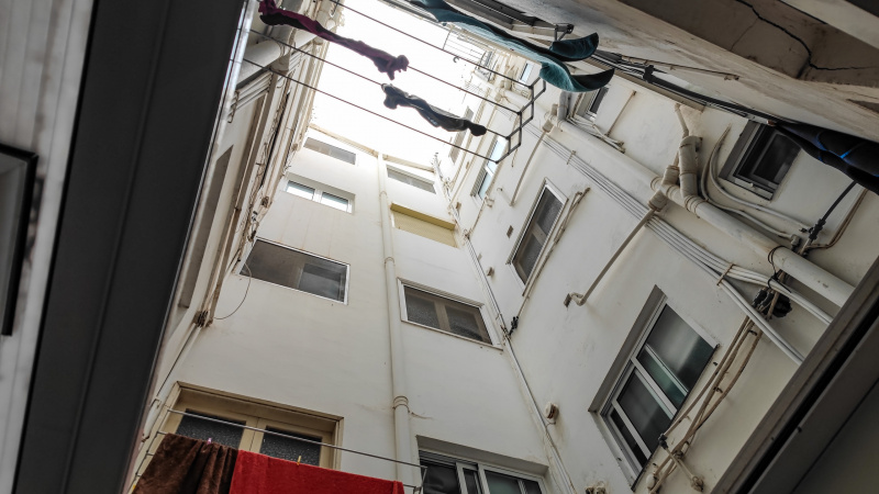 Правда, у коридора сдвигается крыша, и выясняется, что тут есть выход как бы на улицу - внутрь колодца дома. Потрясающее решение. Висит чье-то белье, капает. Женщина в окне курит, пепел сбрасывает тебе на голову - красотища!