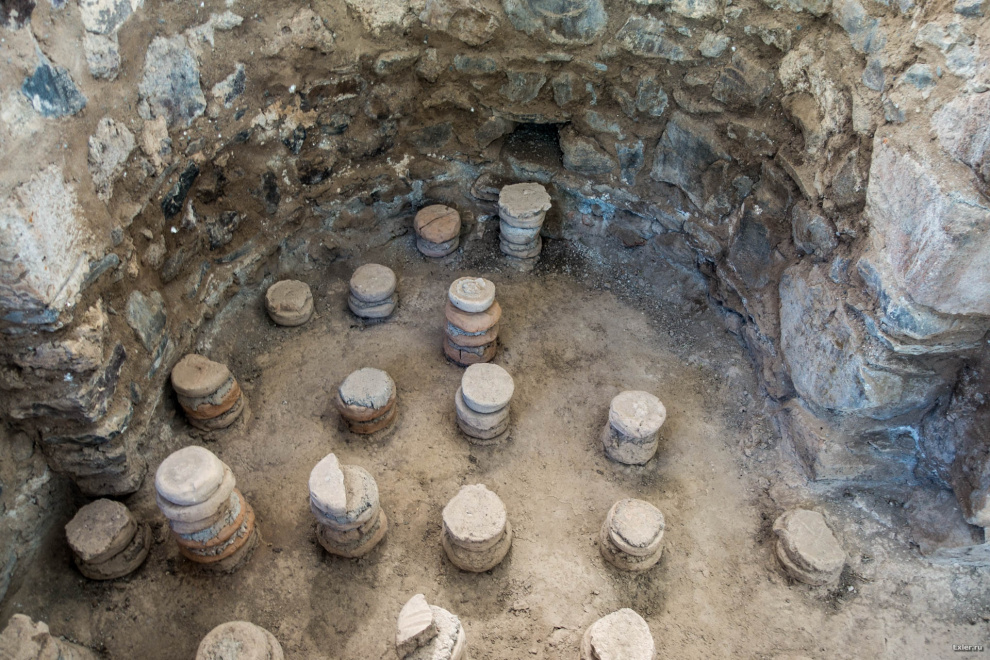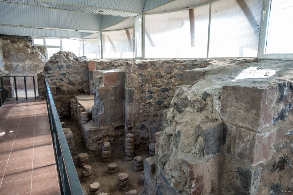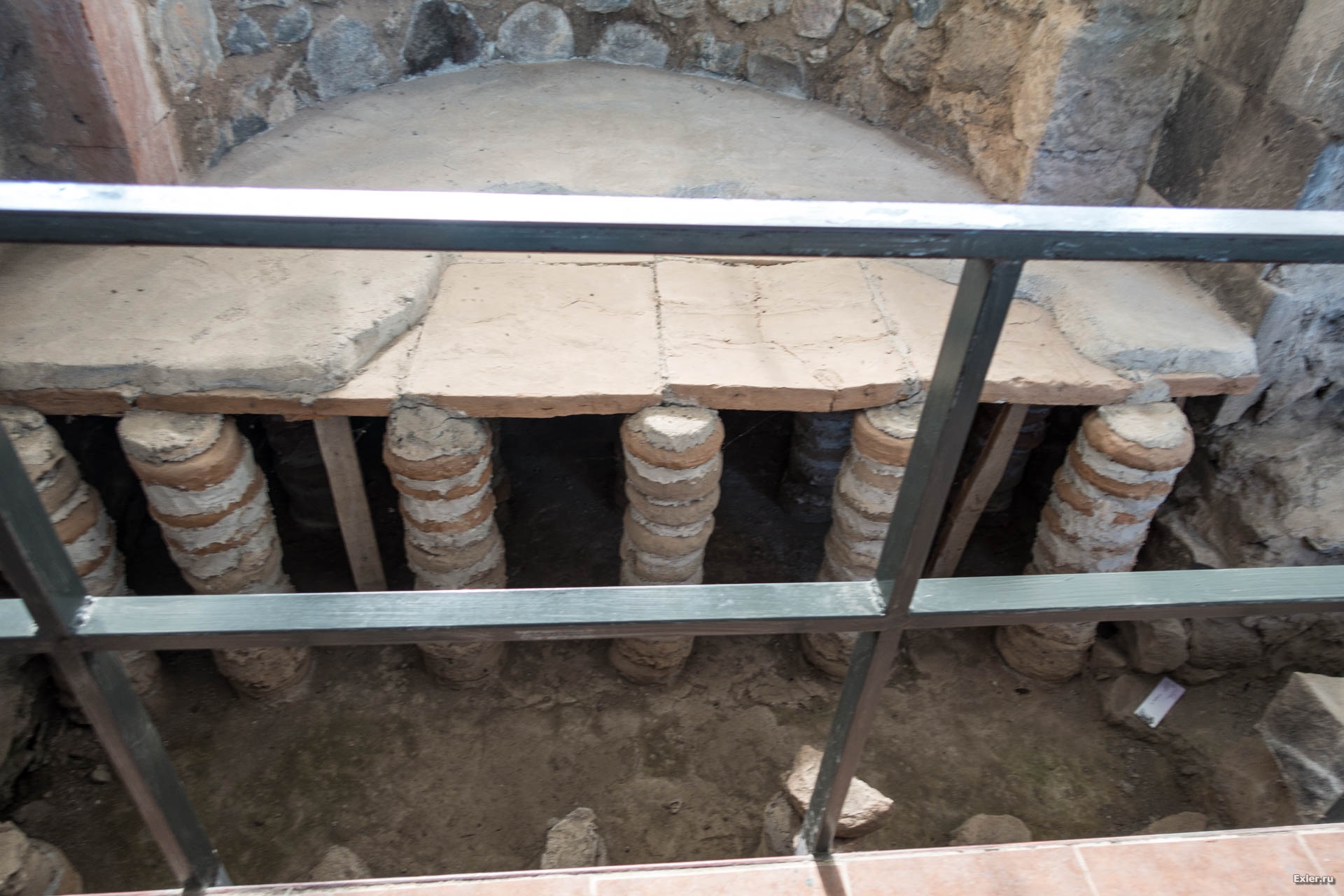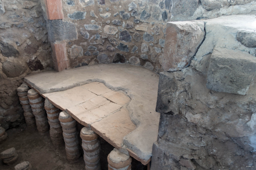 С торца здания в подвальчике разводился огонь. Горячий воздых и дым проходили под двойным полом и нагревали специальные столбики из камней, которые в свою очередь нагревали купальню и воду.
