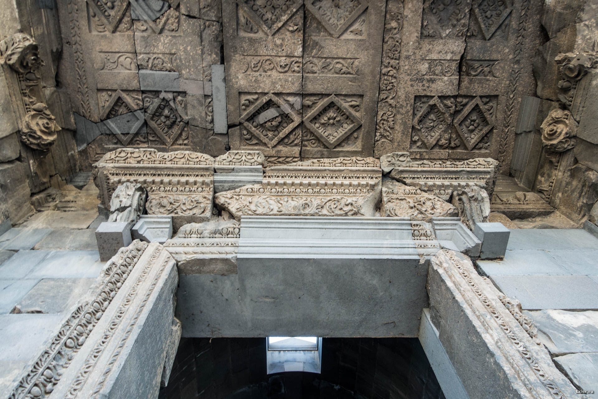 Он потому и виден, что турки, захватив его, стали расковыривать стены в поисках высококачественной стали, которая использовалась для этих арматурин, чтобы сделать из них сабли. Что хорошо видно на следующем фото. Именно поэтому, что из стен храма выковыряли арматуру, он и развалился. А так может быть и не развалился бы.