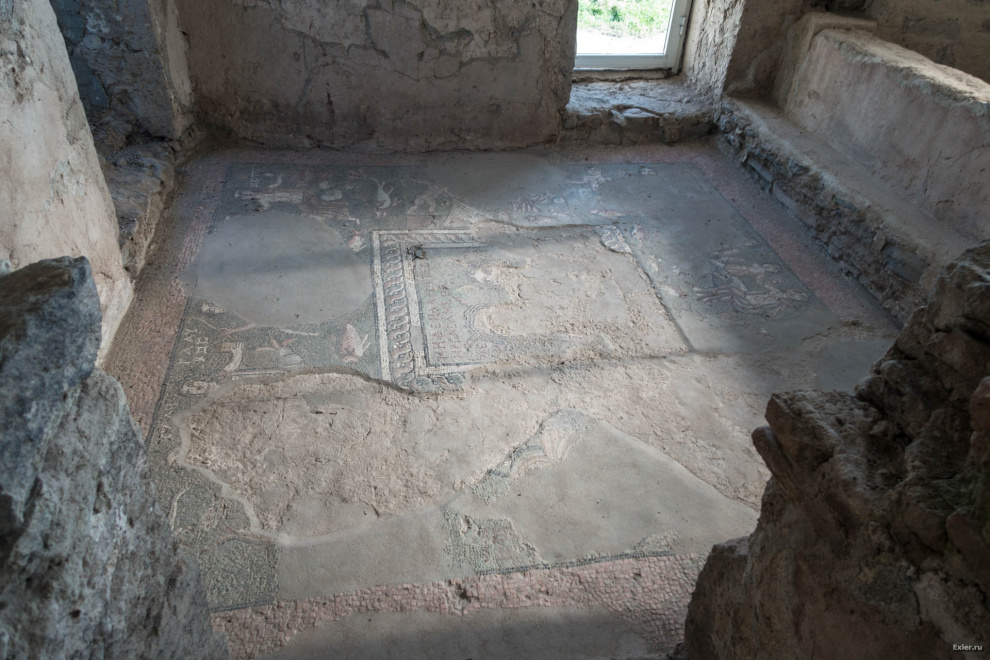 В предбаннике сохранился мозаичный пол. Тут изображены человекоподобные мистические существа - Океания и Море. Над ними надпись на древнегреческом: "Мы тут все построили, а нам ни фига не заплатили". Это не шутка, там так и написано.
