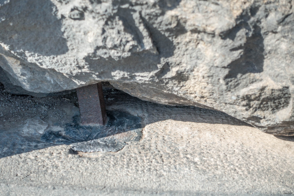 Храм создан во второй половине I века. Тут не использовались никакие скрепляющие растворы - только соединительные железные скобы, которые заливались свинцом: на фото хорошо виден метод крепления.