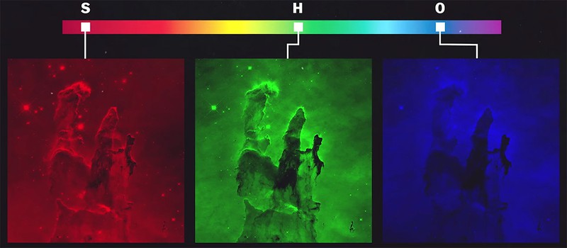 Но обычно так не делают, а делают эти исходные монохромные "негативы" съемкой через узкополосные фильтры, которые пропускают только свет самых ярких линий в линейчатом спектре диффузной туманности: в линиях кислорода (зеленый), водорода (голубой и красный) и серы (дальний красный). Это позволяет отсечь искусственную и естественную засветку наблюдаемого объекта (сплошным спектром). Ну и далее эти монохромные заготовки раскидывают по RGB, получая цветной снимок. Часто для проработки звезд (у них сплошной, а не линейчатый спектр) делают еще дополнительные серии снимков в широком спектре.