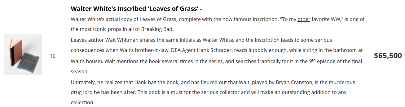 Вроде самый дорогой лот -  книга "Листья травы" Уолт Уитман, принадлежащая Уолтеру Уайту. (Кстати, эта же книга дала название хорошему фильму Тима Блейка Нельсона.)