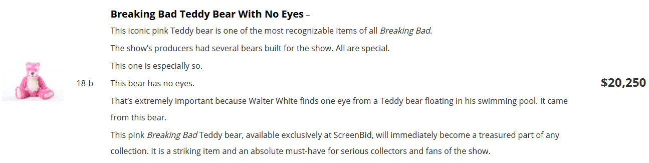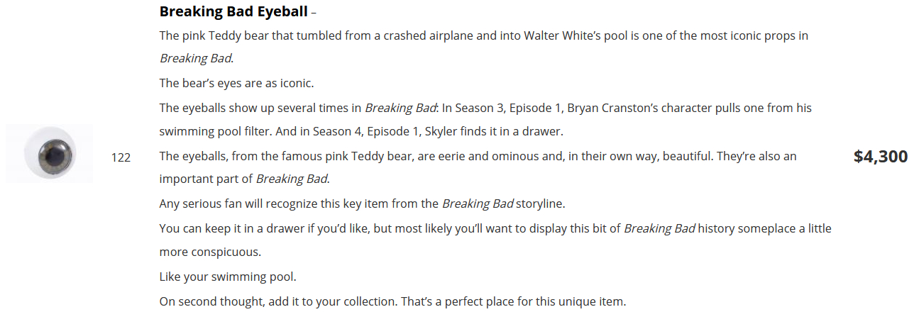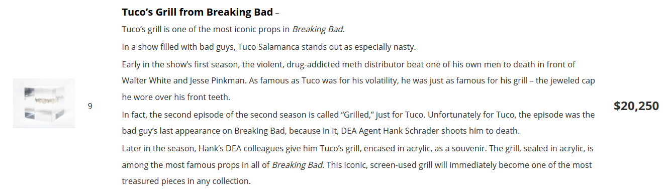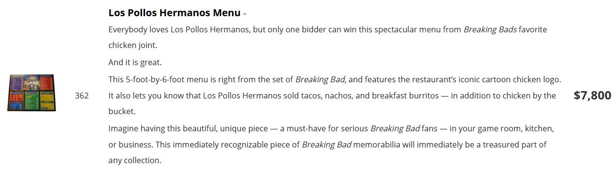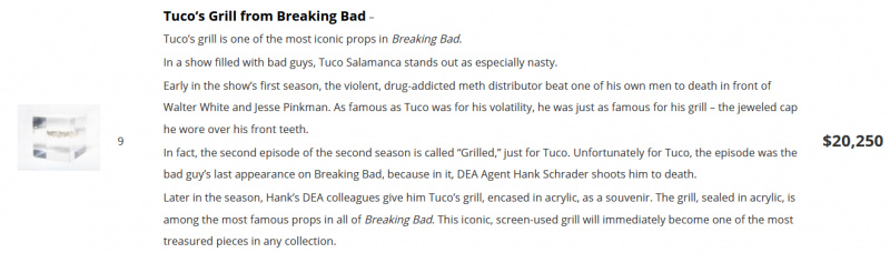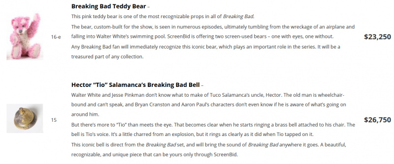 Прислали ссылку на очень забавное - аукцион вещей из сериала "Во все тяжкие". Аукцион, конечно, прошел давно, сразу после окончания съемок. Там весь список поизучать очень интересно, но вот главные хиты!