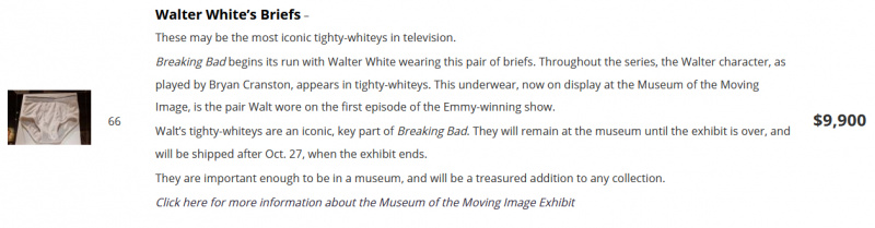 Белые труселя Уолтера Уайта (он в них появляется в самом начале сериала) ушли почти за $10000.
