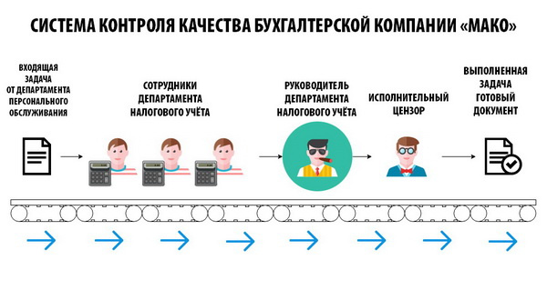 Благодаря этому результат стабилен, качество предсказуемо. Все процедуры выполняются по прописанным регламентам, а каждый отдельный сотрудник – спец в своём деле. Например, один занимается только начислением ЗП, другой — первичной документацией, третий — расчётом налогов и т. д. Благодаря конвейеру качество работы МАКО всегда одинаковое, высокое, предсказуемое. Как бургер из Макдоналдса, который делают несколько человек, каждый из которых занят своей частью работы – всегда одинаково вкусный.
