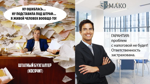 Все документы МАКО проходят многоэтапную проверку, что сводит вероятность ошибки на уровень статистической погрешности. Если всё же МАКО допустит ошибку и она приведёт клиента к штрафу – его оплатит МАКО. Если же ошибается штатный бухгалтер – его невозможно привлечь к ответственности, все риски – на компании. Ответственность МАКО застрахована на 5 000 000 рублей.