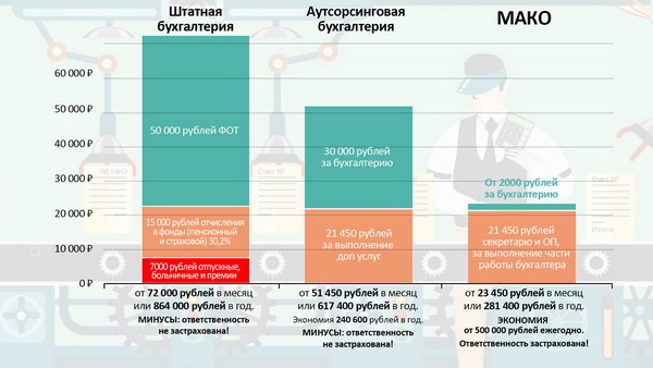 Конвейерный принцип позволяет снизить цену для потребителя. Обслуживание ИП у МАКО стоит от 2 000 рублей в месяц. Обслуживание ООО – в среднем 8 000. В то время как штатный бухгалтер – это от 30-50 000 рублей в месяц плюс налоги, организация рабочего места, коммунальные расходы, бухгалтерский софт и журналы, другие сопутствующие расходы – в сумме это порядка миллиона в год.