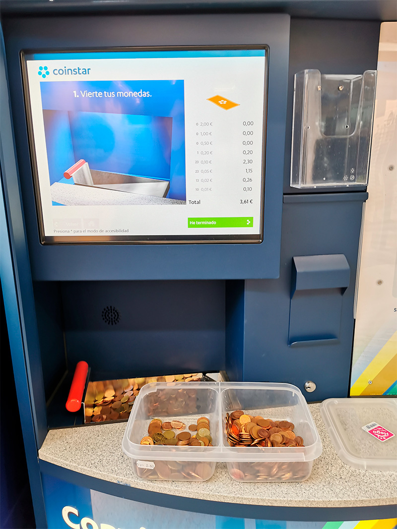 Высыпаешь в лоток, за ручку его поднимаешь - мелочь ссыпается в недро автомата, он тебе показывает, сколько каких монеток и какая общая сумма. Когда все высыпал, нажимаешь на кнопку, тебе выдают чек со штрихкодом и указанной суммой. У меня, кстати, получилось аж 30 евро. Чек обналичивают в кассах Coinstar, которые есть почти в каждом городке. Обалденно удобно, от всей меди скопом избавился. А выбрасывать было жалко!