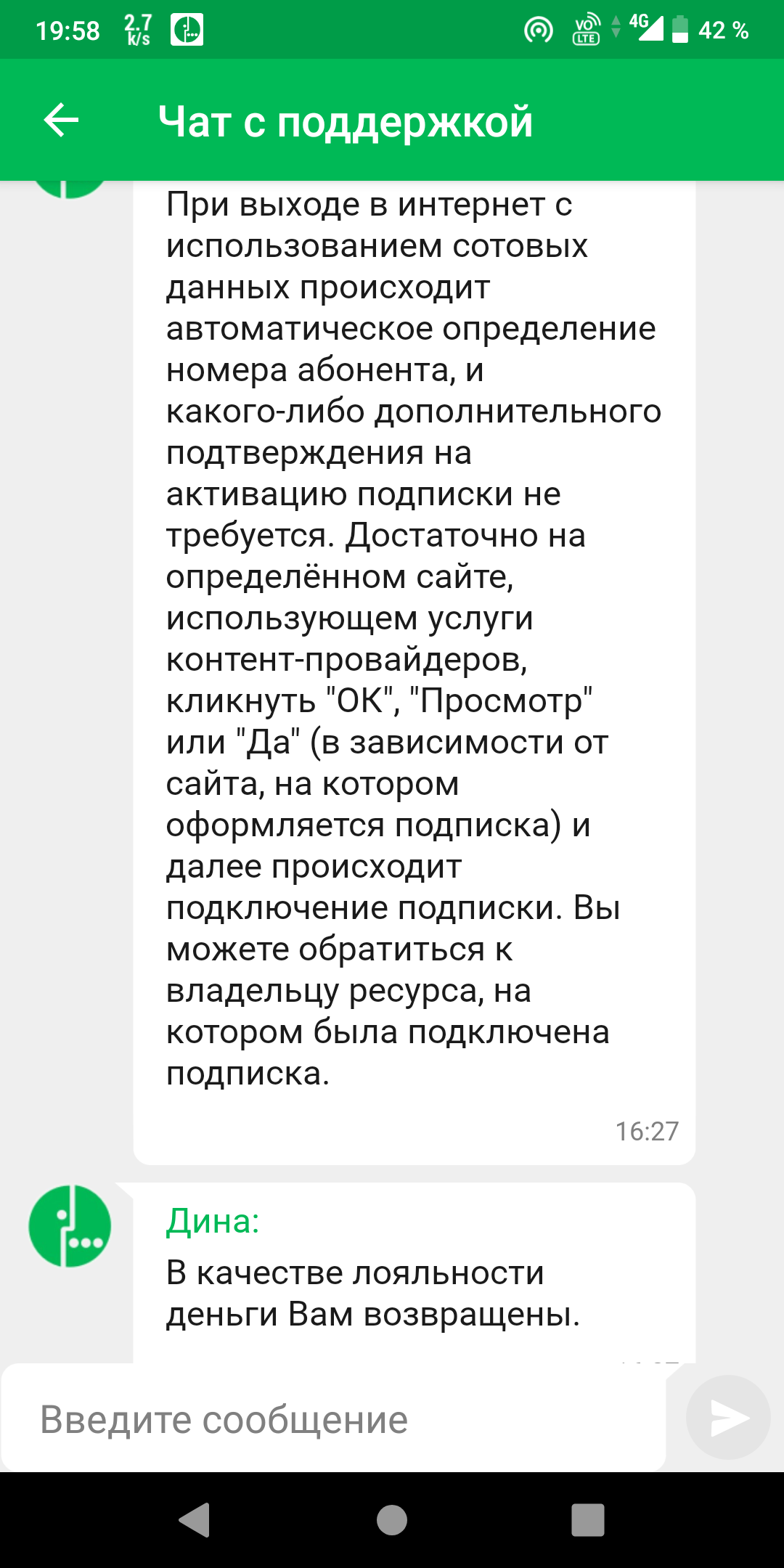 Подписку тут же отключил в личном кабинете. Затем незамедлительно обратился в техподдержку Мегафона, а там у них в чате только робот отвечает: извиняйте, ничего не понимаю, обратитесь к оператору. Тот ответил на сообщение через пару часов и смысл был такой, что типа сами виноваты, смотрите куда нажимаете. Но, как одолжение, соблаговолили вернуть списанное.