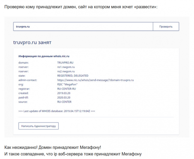 Во-вторых, и это особенно интересно, из вот этой крайне познавательной статьи на "Хабре" выяснилось, что компания "Мегафон" является владельцем доменов по крайней мере некоторых мошеннических сайтов подобного рода. То есть эти так называемые "партнеры" - мегафоновские конторки.