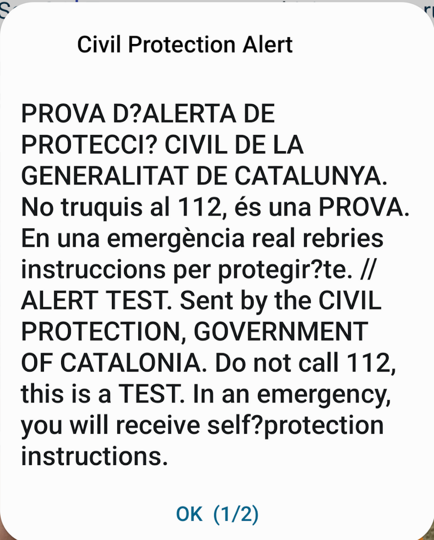 Сегодня в 10 утра в нашем регионе, как потом выяснилось, каталонская Гражданская оборона тестировала систему экстренных оповещений в чрезвычайных ситуациях. Система сработала исправно: смартфон начал истошно визжать совершенно незнакомым и пугающим звуком, одновременно выдав на экран сообщение об опасности. Впрочем, в сообщение было написано, что не надо хватать бриллианты и куда-то бежать, так как это просто тестовая проверка.