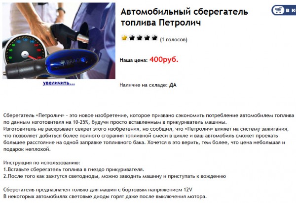 Ну, в принципе, если людям продают обычную пластиковую карточку и утверждают, что она выпрямляет карму, создает защитное поле и стабилизирует внутренние органы (и это дерьмо еще и покупают за $100-200), то почему бы не продавать "сберегатель топлива", который просто вставляется в прикуриватель и там загорается светодиодик?
