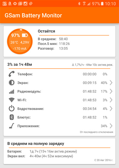Ну, и кроме того, если у вашего смартфона проблемы с энергопотреблением. то всегда имеет смысл контролировать - на что тратится энергия аккумулятора. Для этого существуют различные программы. Одна из самых удобных, на мой взгляд, это Gsam Battery Monitor. C ее помощью вы четко сможете понять, каким образом расходуется потребление энергии в вашем смартфоне.