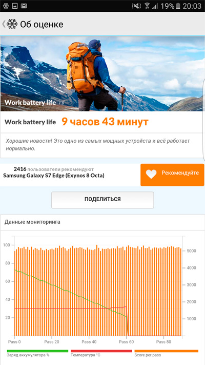 У Samsung Galaxy S6 edge+ PCMark выдал 7 часов 40 минут - в режиме поездки он у меня держался где-то 10-11 часов.