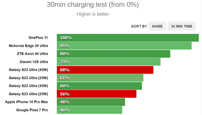 Вот рейтинг GSMArena по скорости зарядки различных смартфонов в течение получаса.