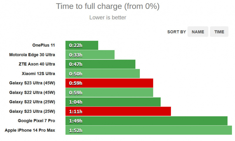 А вот табличка скорости зарядки с нуля. OnePlus 11 всего 22 минуты?!! Круто!