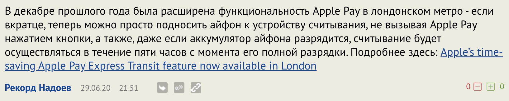 Оказывается, у айфона есть интересная особенность, позволяющая заплатить телефоном даже в том случае, если батарея полностью разряжена и телефон выключен. Не знал об этом - у Небылицкого прочитал.