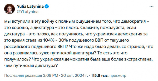 Вы представляете? Это что же надо было делать со страной, третий год сопротивляющеся российской агрессии, чтобы она развивалась хуже путинской диктатуры? Юля не понимает. Не врубается.