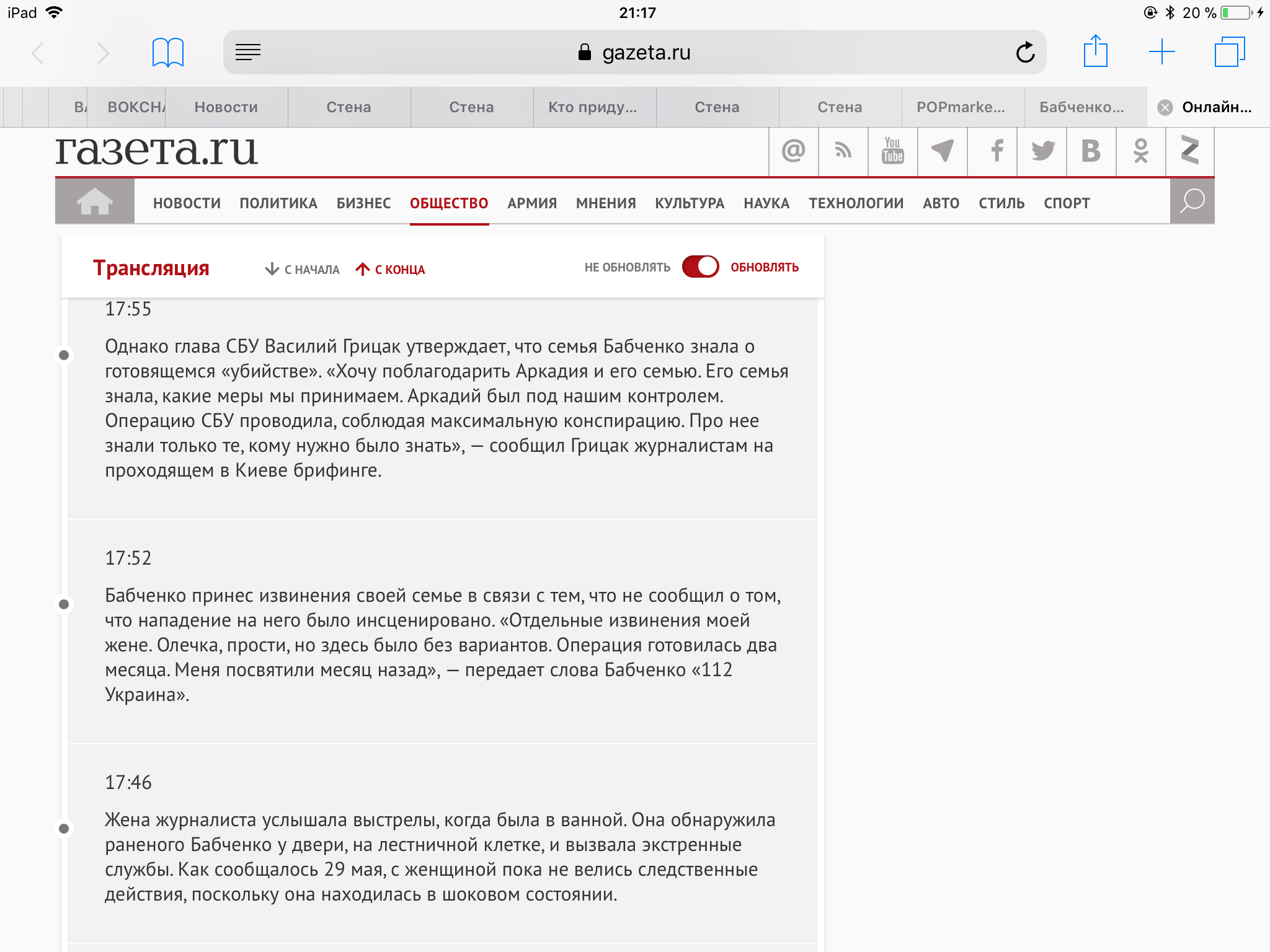 Журналист Аркадий Бабченко не умер в результате покушения. Днем 30 мая Бабченко появился перед журналистами на пресс-брифинге СБУ, где было объявлено, что все произошедшее было частью оперативной операции.