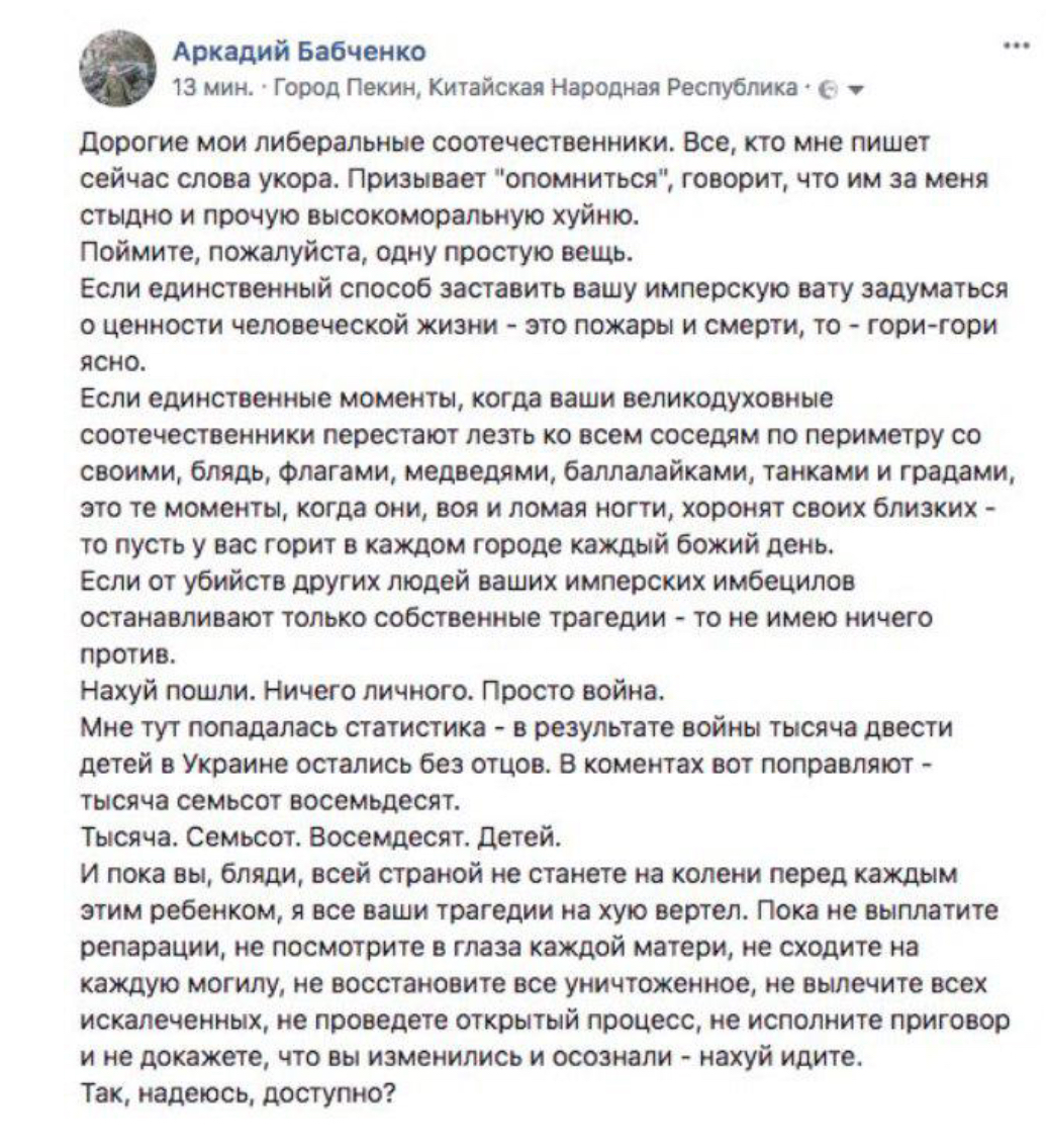 Бабченко - военный человек, говорит прямо. Это лучше, чем под видом вечерних ток-шоу проводить пятиминутки ненависти.