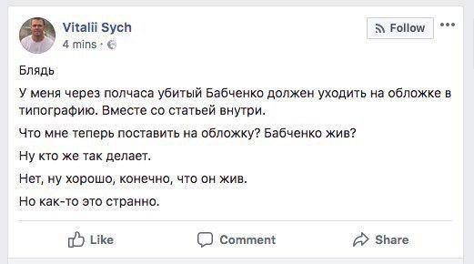 Я, возможно, слишком жестко, но лучше бы его убили! Это абсолютный бред, произошедшее. Бабченко - ненавистник Кремля и ко.? Да сложно даже представить, кто и как мог бы сделать для них лучше! На Эхе Минкин хорошо на эту тему, согласен с ним: echo.msk.ru Могу сказать лично про себя: для меня этот человек, к которому раньше я относился с определенной симпатией, умер. Этот пост - венок на его могилу, читать и слышать про него больше не хочу и не буду. Глупость хуже подлости порой, а в этой истории это еще и органично сочетается.