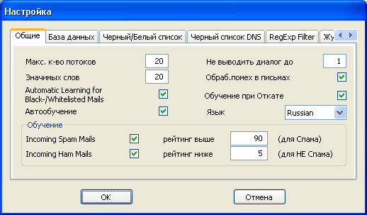 Тогда я, вместо того чтобы снести всю базу и обучать фильтр заново, решил попробовать другой байесовский фильтр, который также имеет плагин для Бата - вот этот. Принцип работы у него точно такой же, как и у Виноградовского: устанавливаете, делаете настройки под себя и обучаете, скормив несколько тысяч спамерских писем и несколько тысяч неспамерских (обучать надо обязательно по двум категориям, иначе будут заметные перекосы).