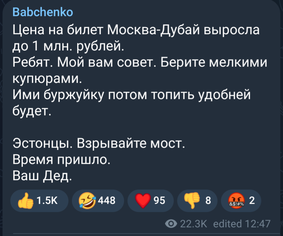 Может, там, в Кремле, всерьез опасаются (и имеют основания для этого), что если они мобилизацию не проведут, то в случае следующего прорыва ВСУ путь на Москву только ДПС прикрывать будет. На Ютуб, к слову, есть замечательное видео о том, как отряд Басаева однажды, в разгар чеченских войн, просто по автотрассам в полном вооружении почти до российской столицы добрался – чисто за взятки.