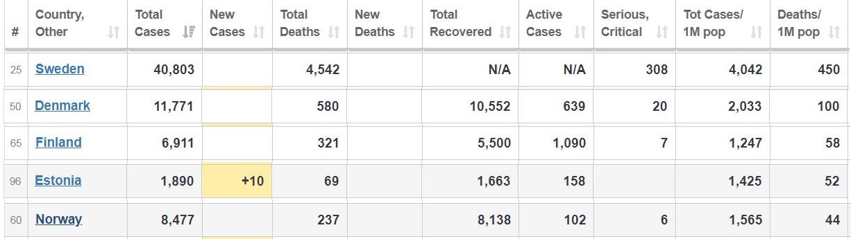 Действительно, в Швеции при населении численностью 10 миллионов человек было зарегистрировано 4542 случая смерти и 40 803 случая инфицирования, в то время как в Дании, Норвегии и Финляндии наблюдались гораздо более низкие показатели: в Дании умерло 580 человек, в Норвегии - 237, а в Финляндии - 321.