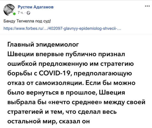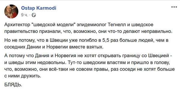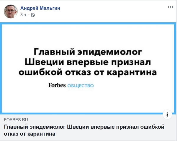 Вчера практически по всем СМИ прошли заметки с заголовками "Главный эпидемиолог Швеции впервые признал ошибкой отказ от карантина", "Главный эпидемиолог Швеции признал, что отказ от строгой изоляции был ошибкой", "Главный эпидемиолог Швеции заявил о гибельных ошибках в борьбе с COVID-19" и так далее, на что, разумеется, сразу же отреагировали известные блогеры, которые постоянно критикуют шведскую модель.
