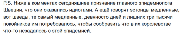 P.S. И напомню еще пару моментов. В Скандинавии нигде не заперли людей по домам с запретом даже просто выходить на прогулки. Впрочем, в Европе таким идиотизмом вроде только в Испании страдали, в остальных странах гулять выходить разрешалось. Также во всей Скандинавии нет обязательного требования носить маски.