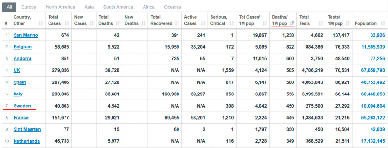 Но даже сейчас, в настоящий момент, все претензии к Швеции касаются только сравнения смертей от коронавируса с соседями, потому что в общей картине Швеция по смертям никак не лидирует.