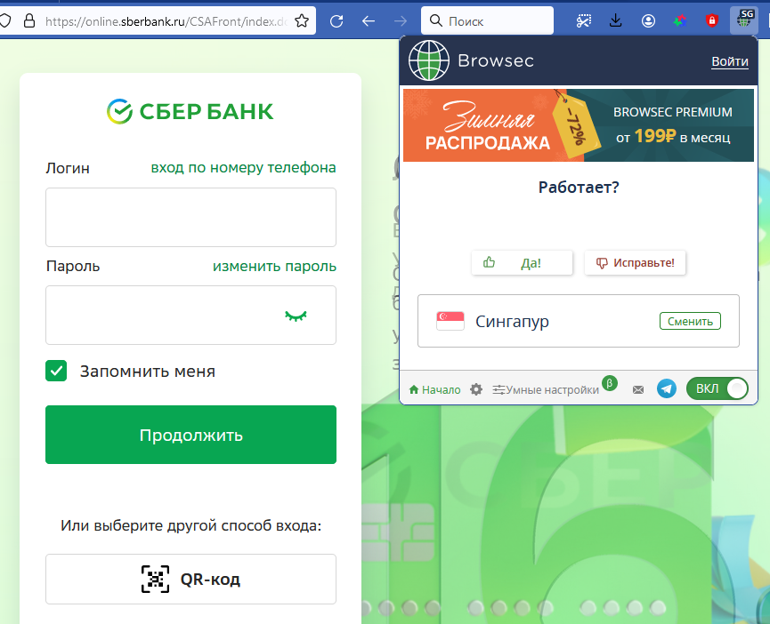 решил ходить в СберОнлайн только через сингапурский ВПН
