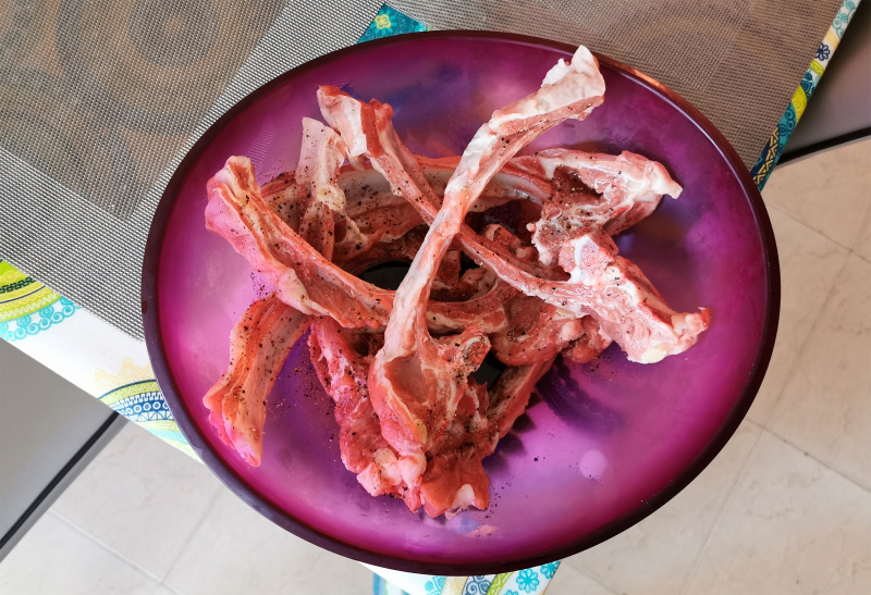 Я уже писал о том, что в сетевых магазинах Испании отдельно бараньи ребрышки (бараньи котлетки), как правило, не купить: баранину там продают только в виде конструктора, где лежит два-три ребрышка, кусочки бараньей ляжки и это все обильно приправлено несъедобными костями, а стоит при этом - 12 евро за упаковку.