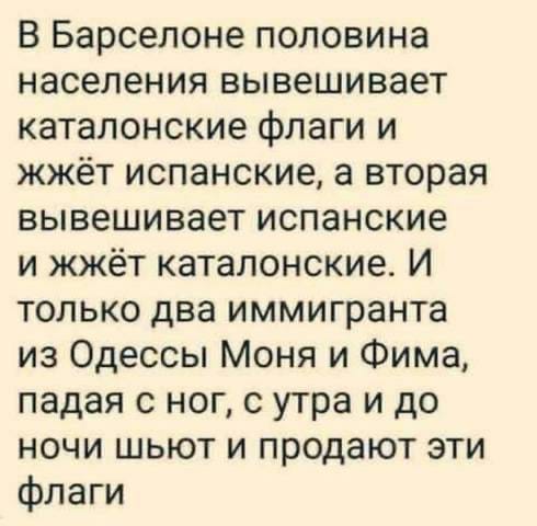 А сейчас там какие-то бунты и беспорядки - при этом, насколько знаю, экономически Каталония как и раньше, цветет и пахнет, и обьективных причин так раздупляться у них по-моему нет.