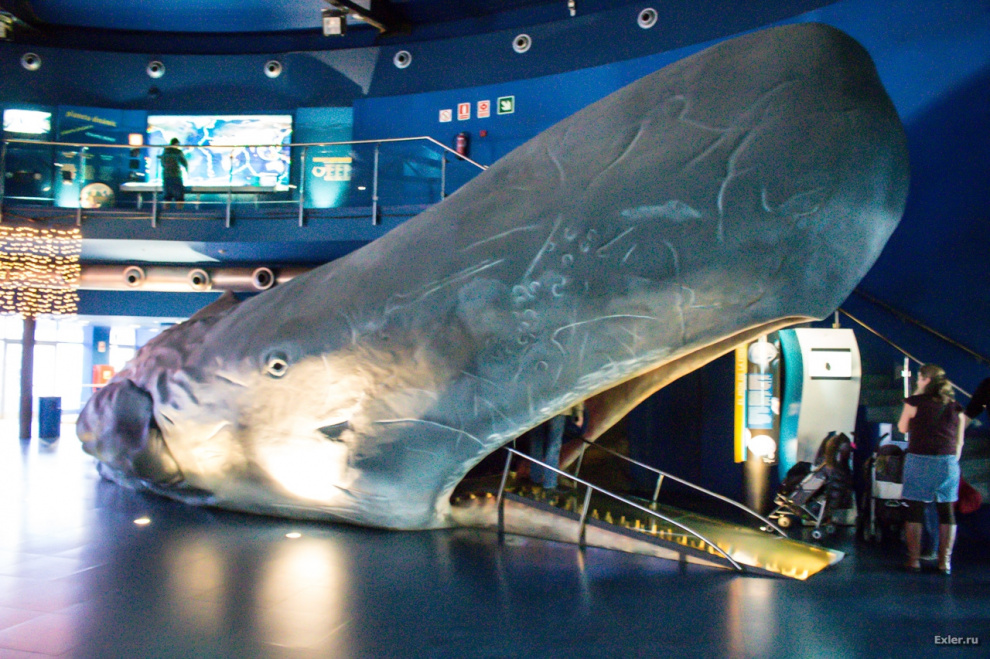 Рядом с выходом находился вот такой забавный аттракцион: можно было забраться в брюхо кашалота, пройти его насквозь и выйти понятно откуда. Внутри него также были всякие небольшие аквариумы. Ребенок был в восторге.