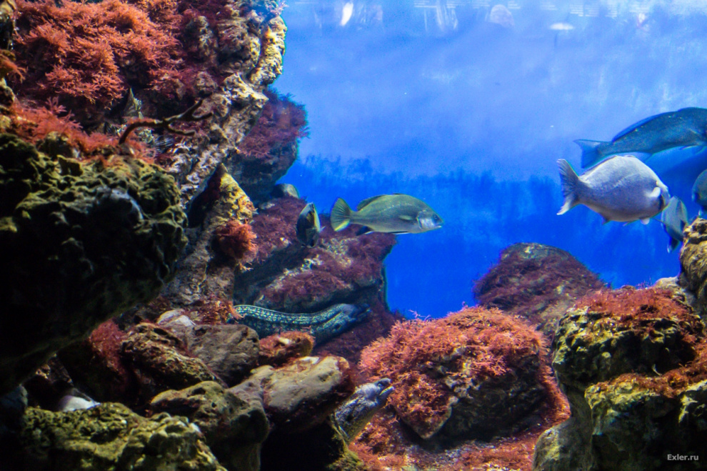 Олбанский Лефф: Мурена практически безопасна для человека, а вот "Один из самых популярных видов рыб в океанариуме. Рядом с ними больше всего народу толпилось" - это и есть СМЕРТЬ, при чём мгновенная, от малейшего касания, это рыбы-зебра, она же рыба-крылатка. Укол колючками этой рыбы очень болезнен. За резкой болью следует ухудшение состояния, которое заканчивается параличом скелетной и дыхательной мускулатуры. Поражающий яд - Тетродотоксин.