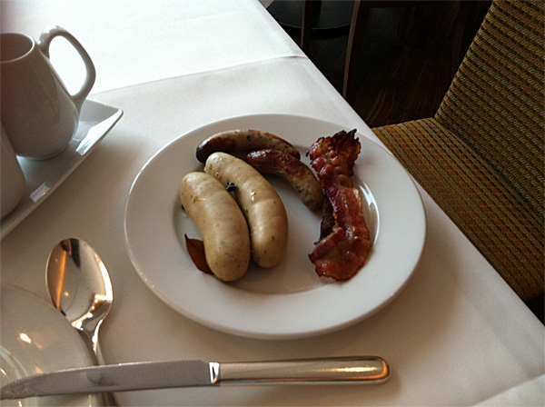 Вот эти белые баварские колбаски едят только на завтрак. Их варят с лавровым листом и душистым перцем - получается очень вкусно. За попытку заказать такие колбаски на обед или, не дай бог, ужин - подвергают общественному остракизму. Но это еще что, в XIX веке за такое кощунство вообще побивали пивными кружками и изгоняли из города. Сейчас времена значительно более либеральные.