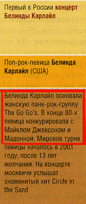 В Москву приехала певичка Белинда Карлайл. Что-то смутно знакомое, да? Во времена перестройки, когда по "2х2" стали гонять всякий западный попс, там много раз запускали ее заунывный "хит" Circle in the Sand. Больше у нее хитов, насколько я помню, не было, да и за этот нужно было изолировать от общества. Впрочем, она самоизолировалась на 13 лет, но недавно вдруг всплыла. Даже в Москву приехала. Но суть не в этом. Суть в том, как о ней пишут - О КАК: