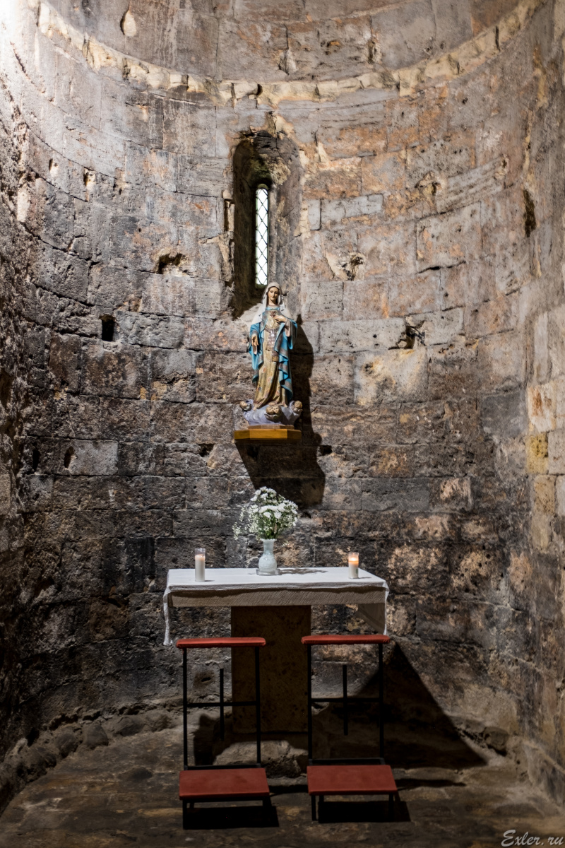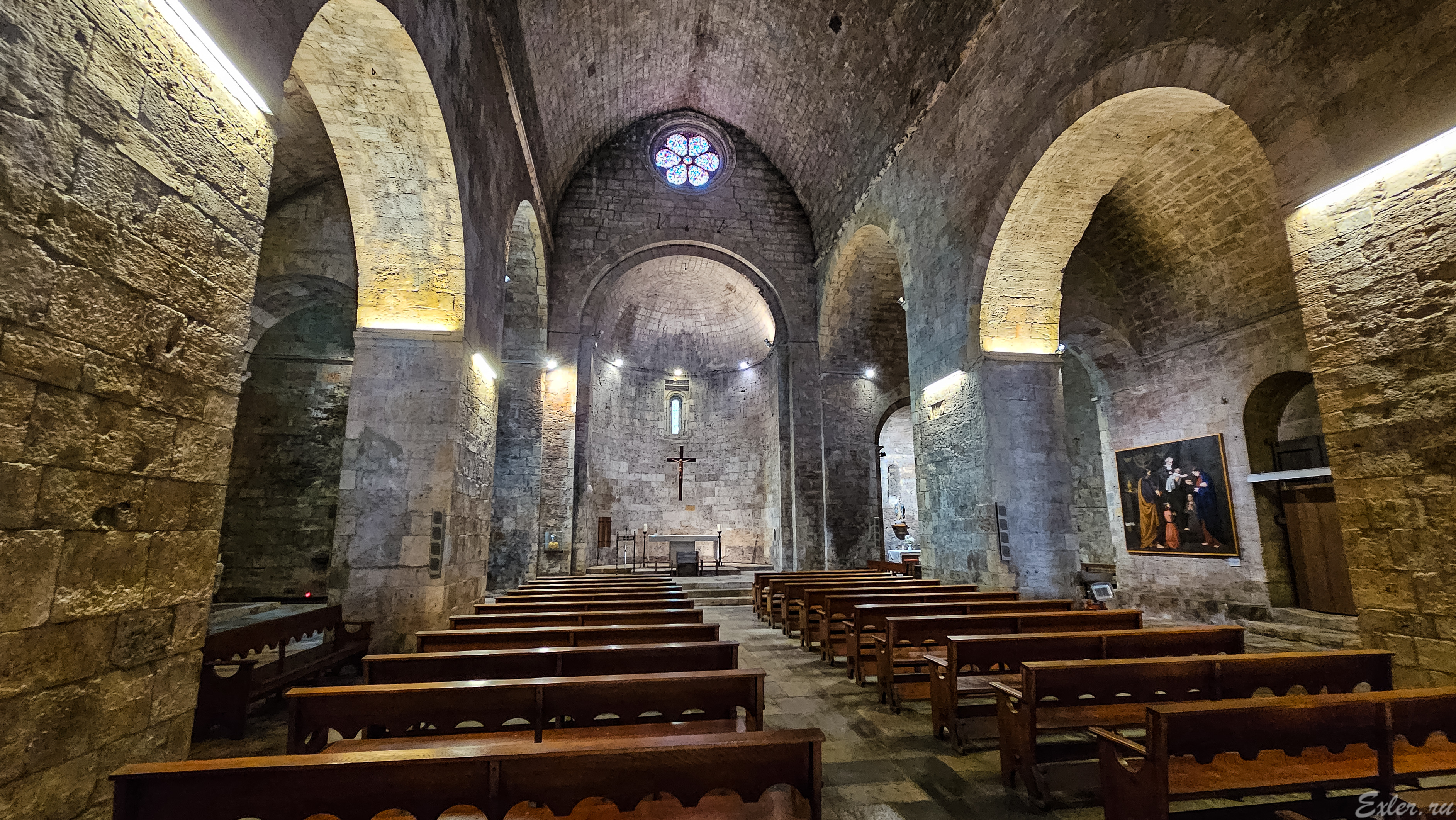 Церковь Сан Висенс - типа XI века. Внутри там почти ничего нет, но это не мешает бодрой бабушке взимать по евро с человека - за право посидеть в холодке церкви и получить отпечатанный листок на каталанском с историей этого строения. Там еще забавно было - бабушка спросила моих друзей "Do you speak english?", те ответили утвердительно, после чего бабушка им стала что-то объяснять на страшно примитивном испанском. Потом ей сказали, что на французском тоже можно (французов-туристов в этих местах - полно), тогда бабушка облегченно вздохнула, сказала, что на французском ей намного проще, чем на английском (что бы это ни означало, потому что на английском она вообще не говорит), после чего спокойно перешла на родной каталанский, решив, что и так сойдет.