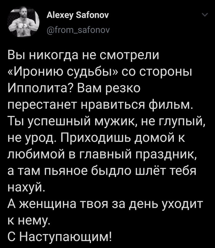 Кстати, именно об этом и «Ирония судьбы», ввиду чего и пользуется такой бешеной популярностью. Чрезвычайно качественный фильм с художественной точки зрения и до скрежета в зубах уебищный с точки зрения социальной. Судите сами: чем всю жизнь занимается герой Женя Лукашин? У него ТРАДИЦИЯ — каждый год бессмысленно ходить в баню и нажираться там оливье и водярой, как последняя свинья. Жалкая жизнь этого лузера течет своим бессмысленным чередом: ему уже за тридцать лет, но в его жизни ничего так и не поменялось, он как жил с мамой, так и продолжает с нею жить на склоне своих никчемных лет. В конечном счете типичный совковый бухарик, в очередной раз объебавшись оливье с водярой, находит обалденную чиксу, которая ради него, унылого лузера, бросает крутого солидного мужика и прыгает к нему в постель. Эдакая сказка и мечта: всю жизнь живи, как в дне сурка по зараннее разработанным шаблонам, а потом тебе с нихуя бац, и клевая телка на бошку сверху свалится с квартирой в Москве и даже уйдет ради такого никчемного пьяного говна от настоящего альфача."