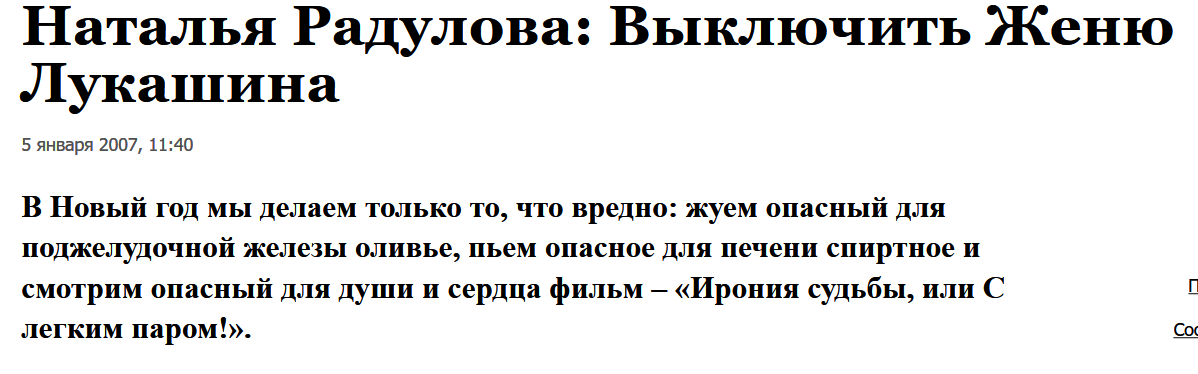 "Вы можете представить себе, что будет, если однажды на Новый год перестанут продавать зеленый горошек и не покажут «Иронию судьбы»? Если вы застанете такое событие, возьмите секундомер, подойдите к окну и засеките! Я вас уверяю, что ровно через пять минут увидите, как люди начнут выбрасываться из окон, т.к. в одночасье потеряют смысл жизни.