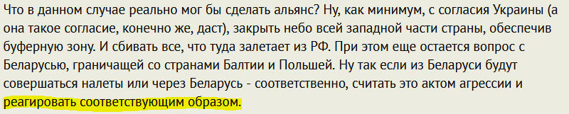 Я в субботу как раз об этом и писал, что единственный разумный ответ НАТО на эту провокацию Путина - создание бесполетной зоны над Украиной - по крайней мере, над ее западной частью, чтобы создать буферную зону, в которой сбивать все российское военное дерьмо, летящее в Украину и в страны Европы.