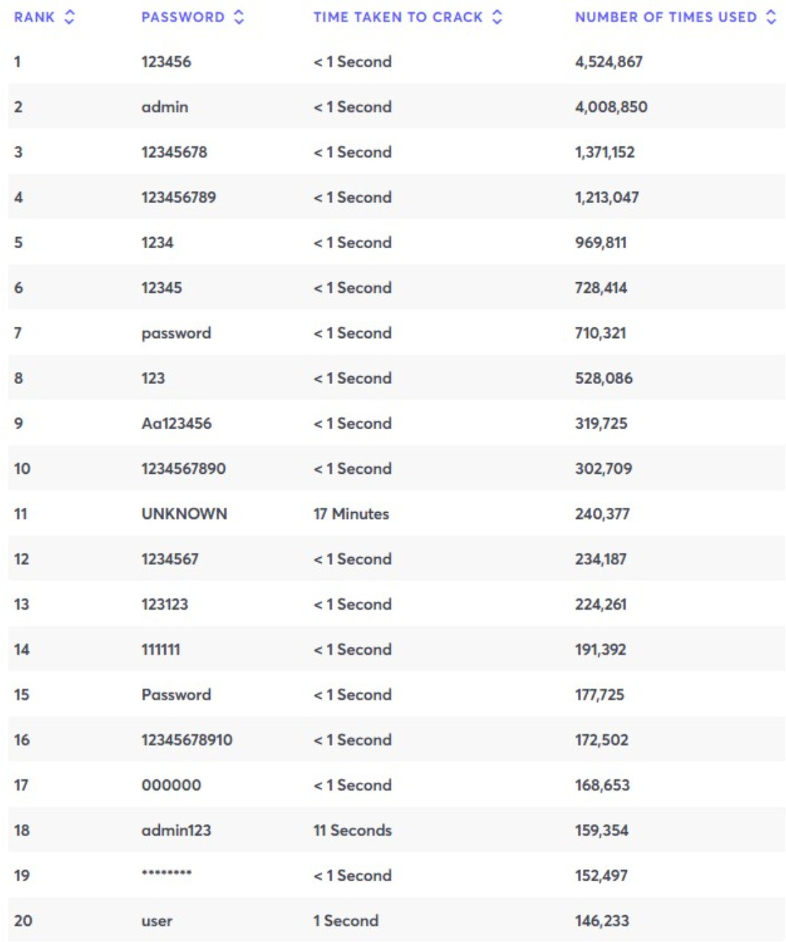 Компания Nordpass опубликовала наглядную табличку с самыми бесполезными паролями этого года, которые тем не менее активно используются, и показала, сколько времени потребуется на взлом каждого из них.
